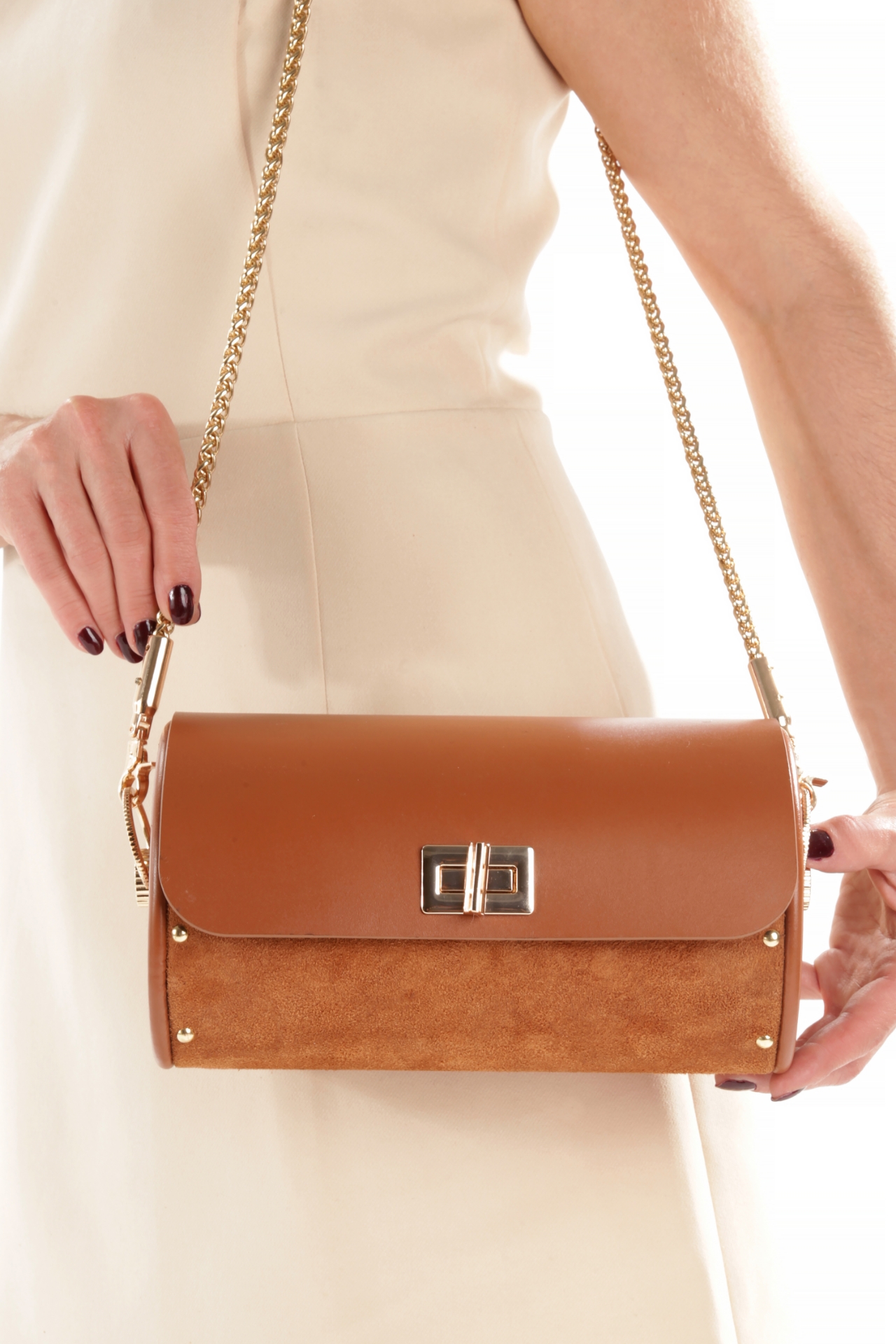 - Altın tonlarında zincir askı ve metal aksesuarları modern ve şık bir görünüm kazandırır.